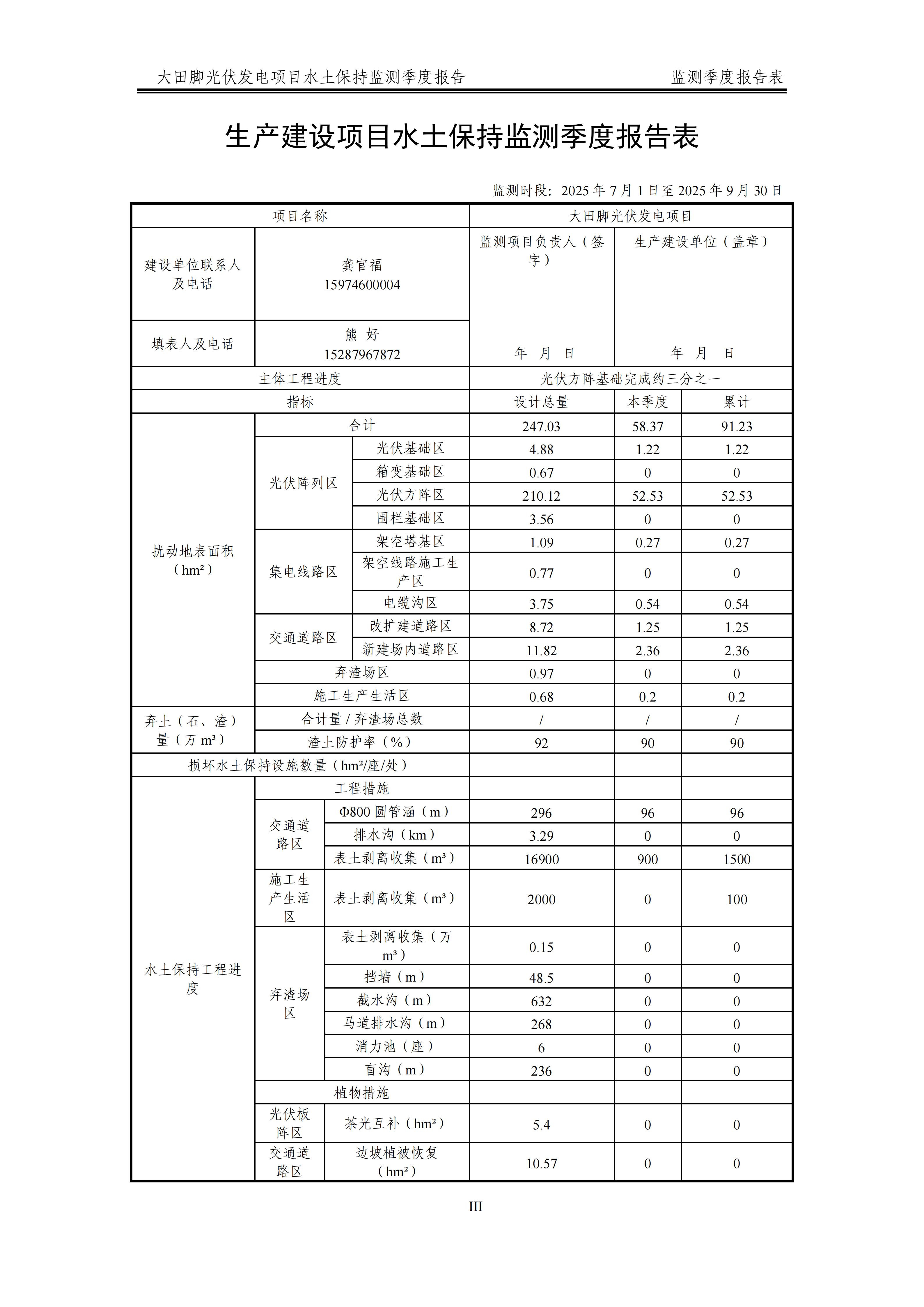 项目监测组于2025年7月1日至2025年9月30日,开展了全面的监测,其中防治责任范围,扰动地表情况,每月进行一次监测;土壤流失量在每次降雨后进行监测,并在月底统计汇总土壤流失量;以《生产建设项目水土保持技术标准》(GB50433-2018)、《生产建设项目水土流失防治标准》(GB/T50434-2018)和《水利部办公厅关于印发生产建设项目水土保持监测规程(试行)的通知》(办水保〔2015〕139号)的有关规定和要求,全面了解工程建设情况,并结合收集的相关资料,对工程中存在的水土流失隐患问题提出意见和建议,形成《大田脚光伏发电项目水土保持监测季度报告(2025年第3季度,总第2期)》。